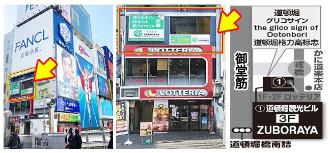 ●14番出口又は15番B出口より御堂筋を北へ直進し「はり重」角を右(東)へ曲がり、道頓堀をまっすぐ「かに道楽本店」へ。対面の「ロッテリア」のある『道頓堀観光ビル3階』です。
